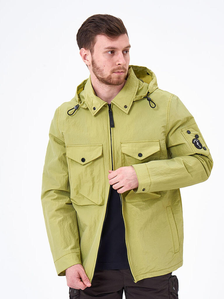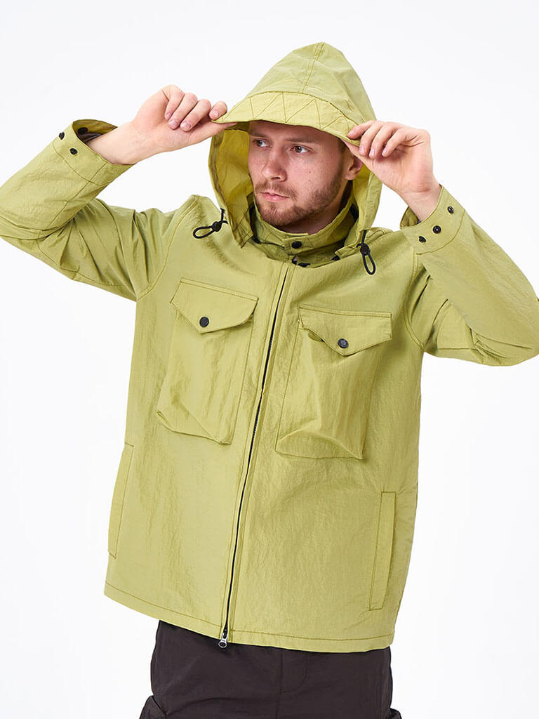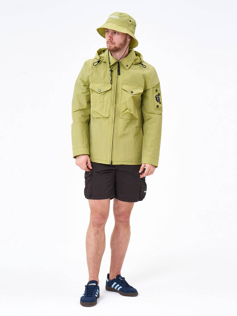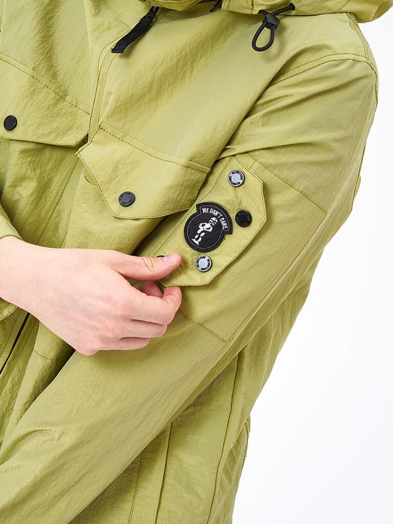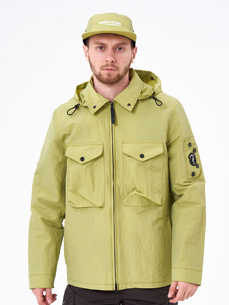 We Don’t Care Hooded Overshirt — легкая куртка из нейлона с эффектом мятой ткани и защитой от дождя и ветра. Вдохновляясь армейской тематикой, мы дополнили классический овершот вместительными передними карманами на кнопках и съемным капюшоном на молнии. Куртка имеет удобный внутренний карман. Капюшон регулируется шнурами с фиксаторами, а козырек на капюшоне при необходимости фиксируется на кнопки. Карман на рукаве, с логотипом бренда, как отсылка к военной униформе. Фурнитура бренда YKK.