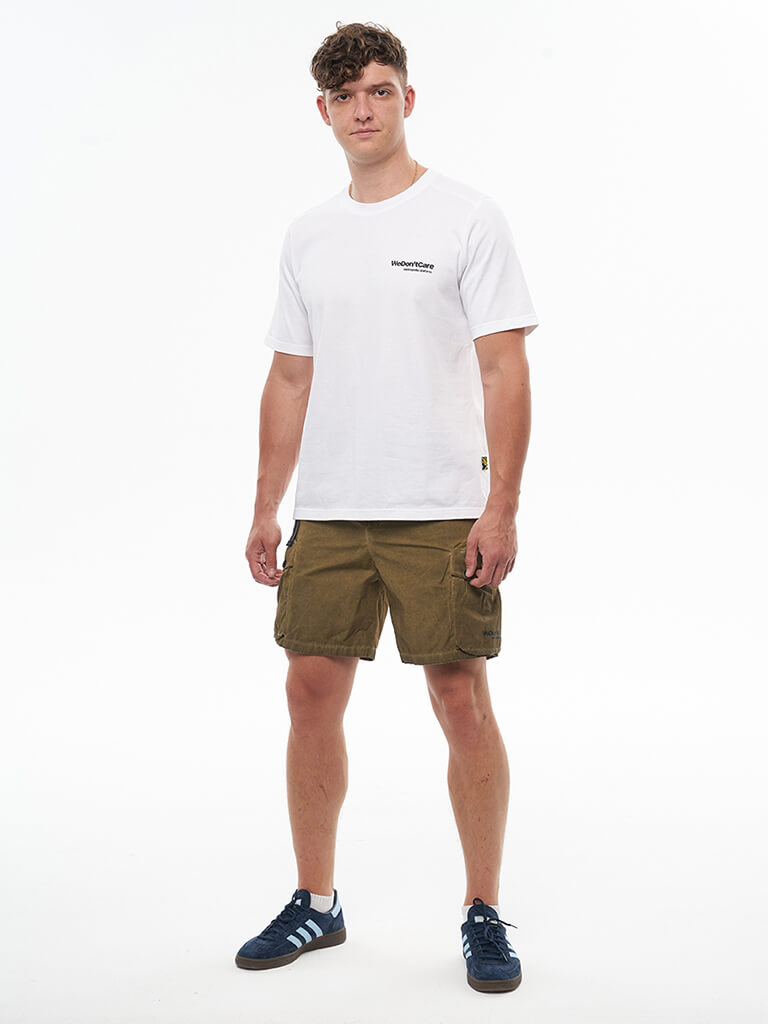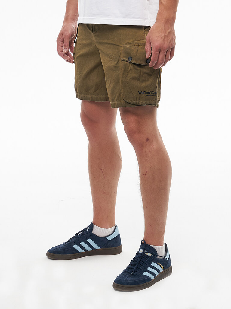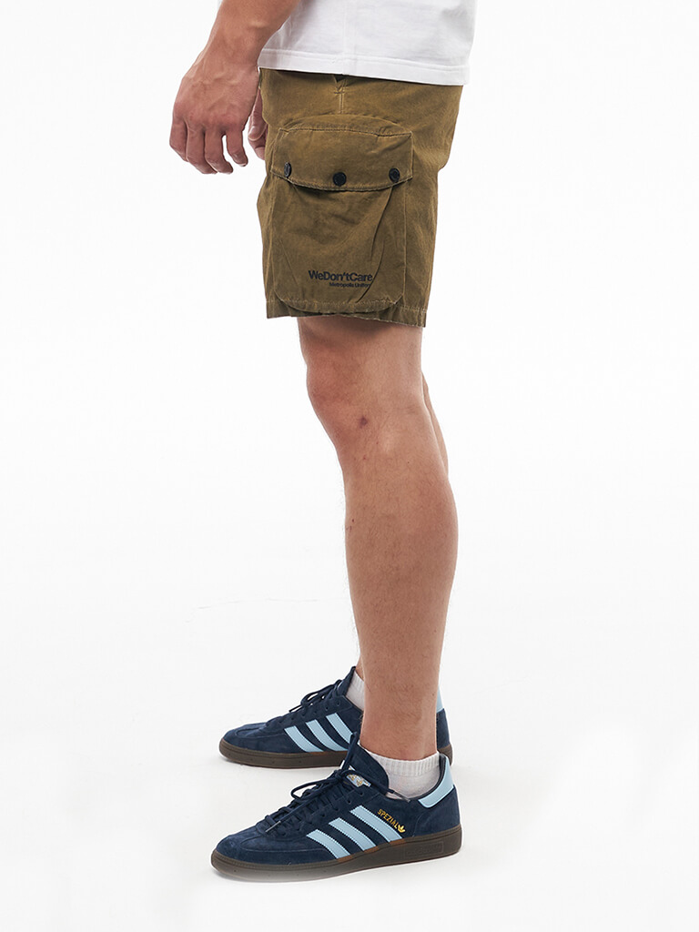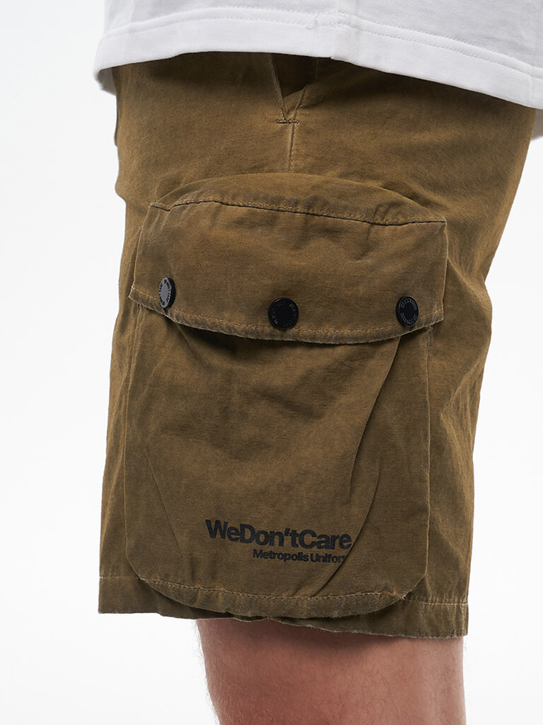 Карго шорты вдохновленные военной тематикой. Гульфик застегивается на молнию и джинсовую пуговицу. Пояс надежно фиксируется стропой с легкой металлической пряжкой. Шорты имеют вместительные боковые карманы на кнопках, боковые карманы для рук и 2 задних кармана. На левом кармане расположен логотип бренда We Don’t Care. Изделие окрашено в готовом виде.
