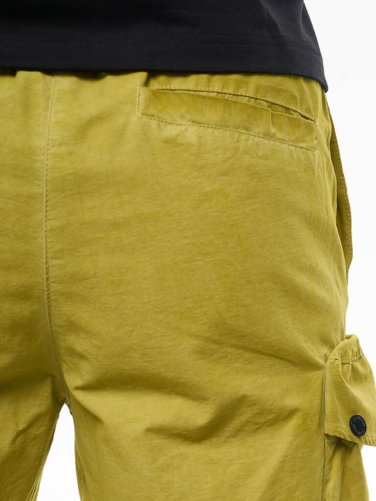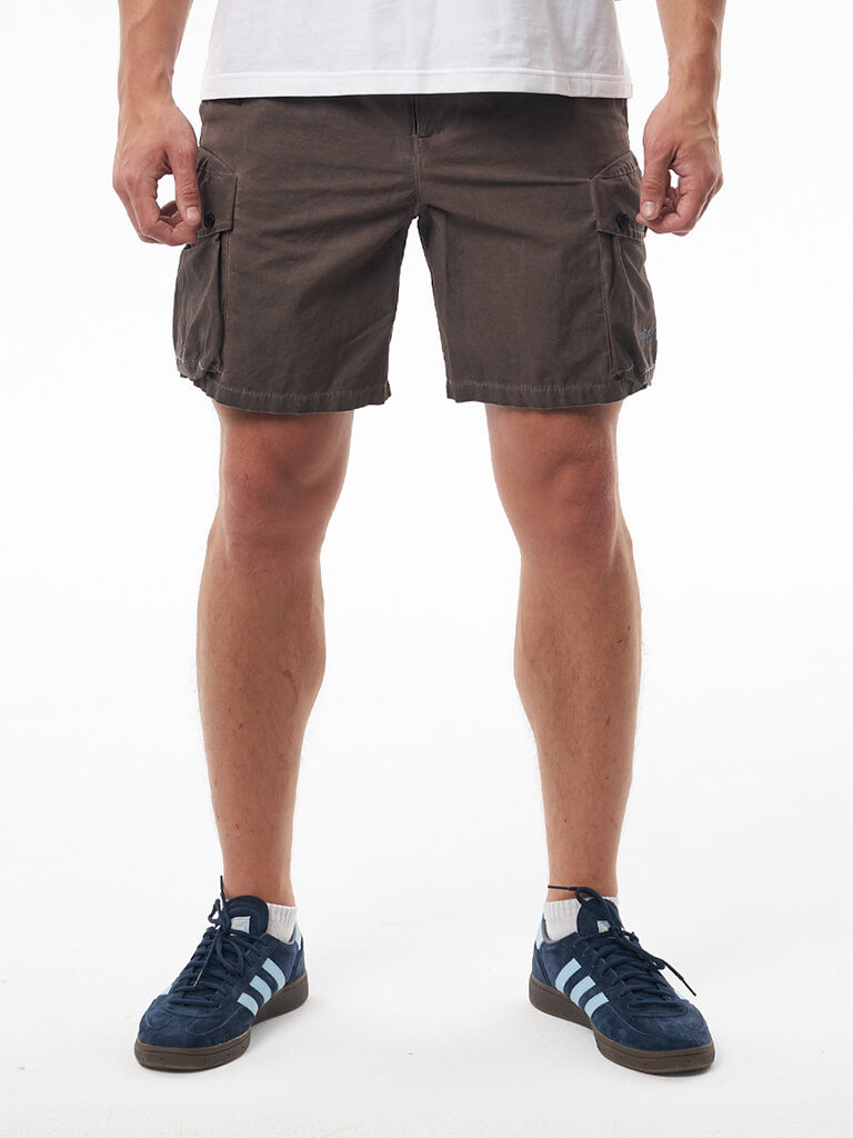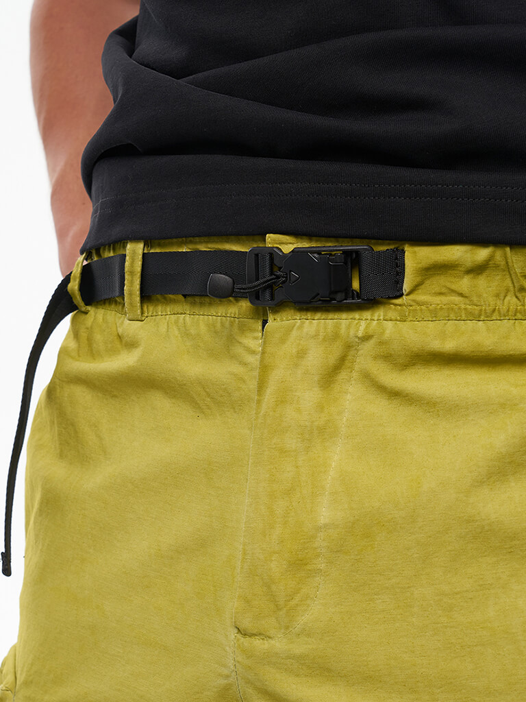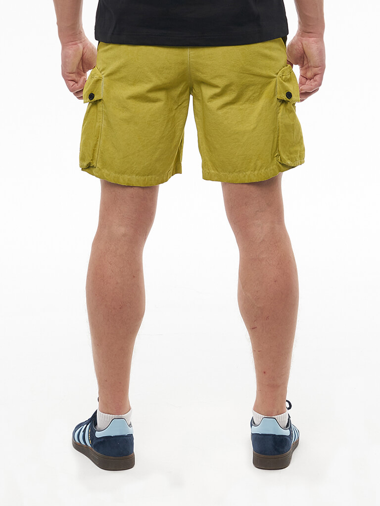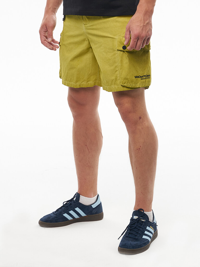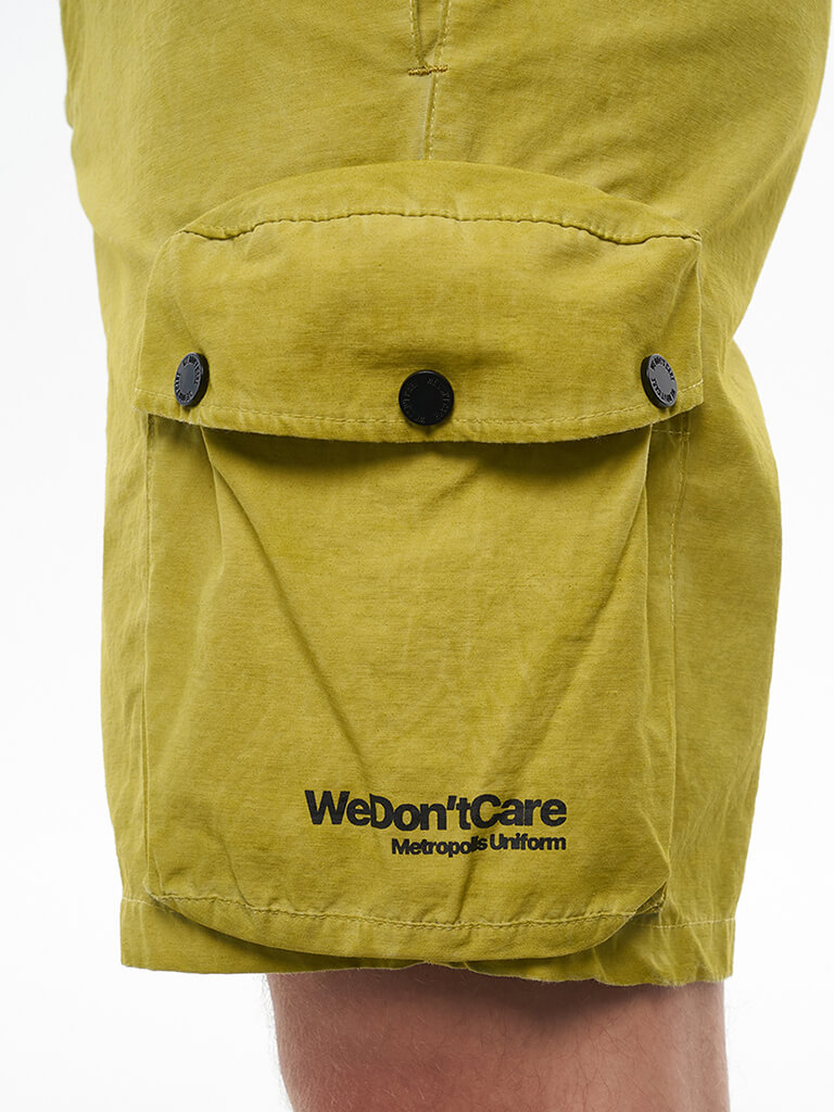 Карго шорты вдохновленные военной тематикой. Гульфик застегивается на молнию и джинсовую пуговицу. Пояс надежно фиксируется стропой с легкой металлической пряжкой. Шорты имеют вместительные боковые карманы на кнопках, боковые карманы для рук и 2 задних кармана. На левом кармане расположен логотип бренда We Don’t Care. Изделие окрашено в готовом виде.