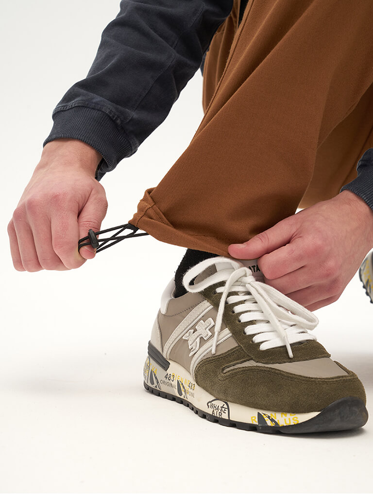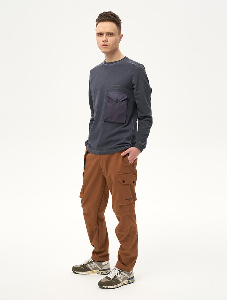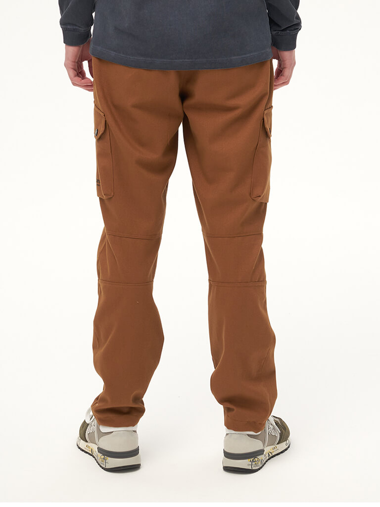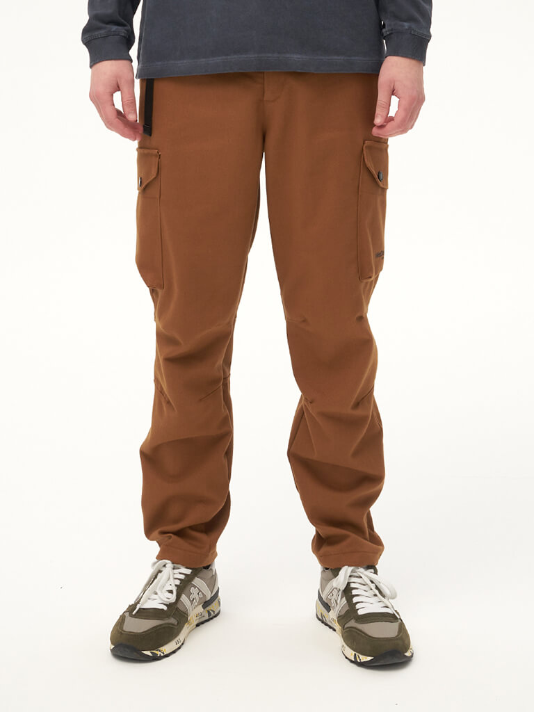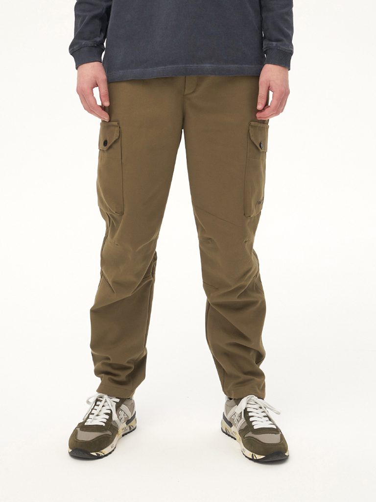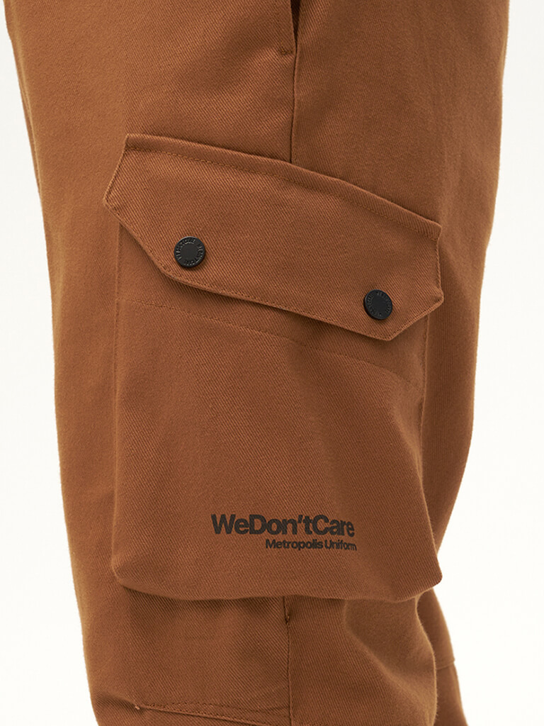 Хлопковые карго брюки вдохновленные архивными моделями армейских штанов. Для изготовления брюк использовался твилл плотностью 8 унций. Гульфик застегивается на молнию и джинсовую пуговицу. Пояс надежно фиксируется стропой с легкой металлической пряжкой. Низ штанины утягивается шнуром с фиксатором. Брюки имеют 2 передних кармана на кнопках, боковые карманы для рук и 2 задних кармана. На левой штанине расположен логотип бренда We Don’t Care.