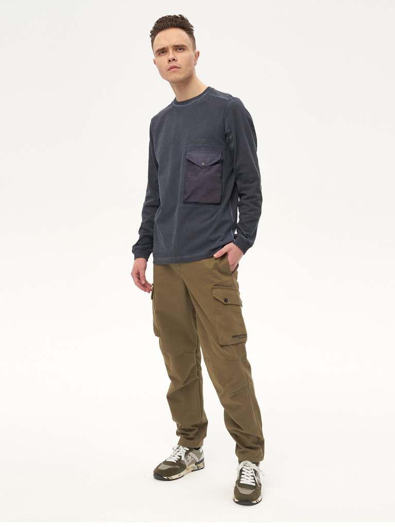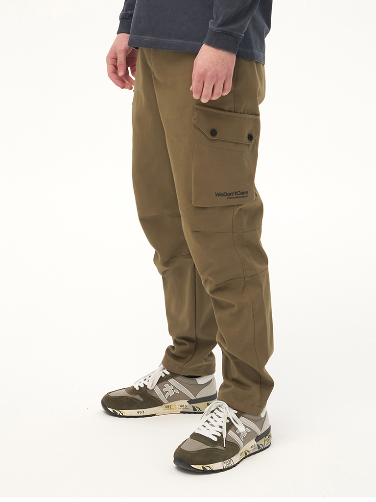 Хлопковые карго брюки вдохновленные архивными моделями армейских штанов. Для изготовления брюк использовался твилл плотностью 8 унций. Гульфик застегивается на молнию и джинсовую пуговицу. Пояс надежно фиксируется стропой с легкой металлической пряжкой. Низ штанины утягивается шнуром с фиксатором. Брюки имеют 2 передних кармана на кнопках, боковые карманы для рук и 2 задних кармана. На левой штанине расположен логотип бренда We Don’t Care.